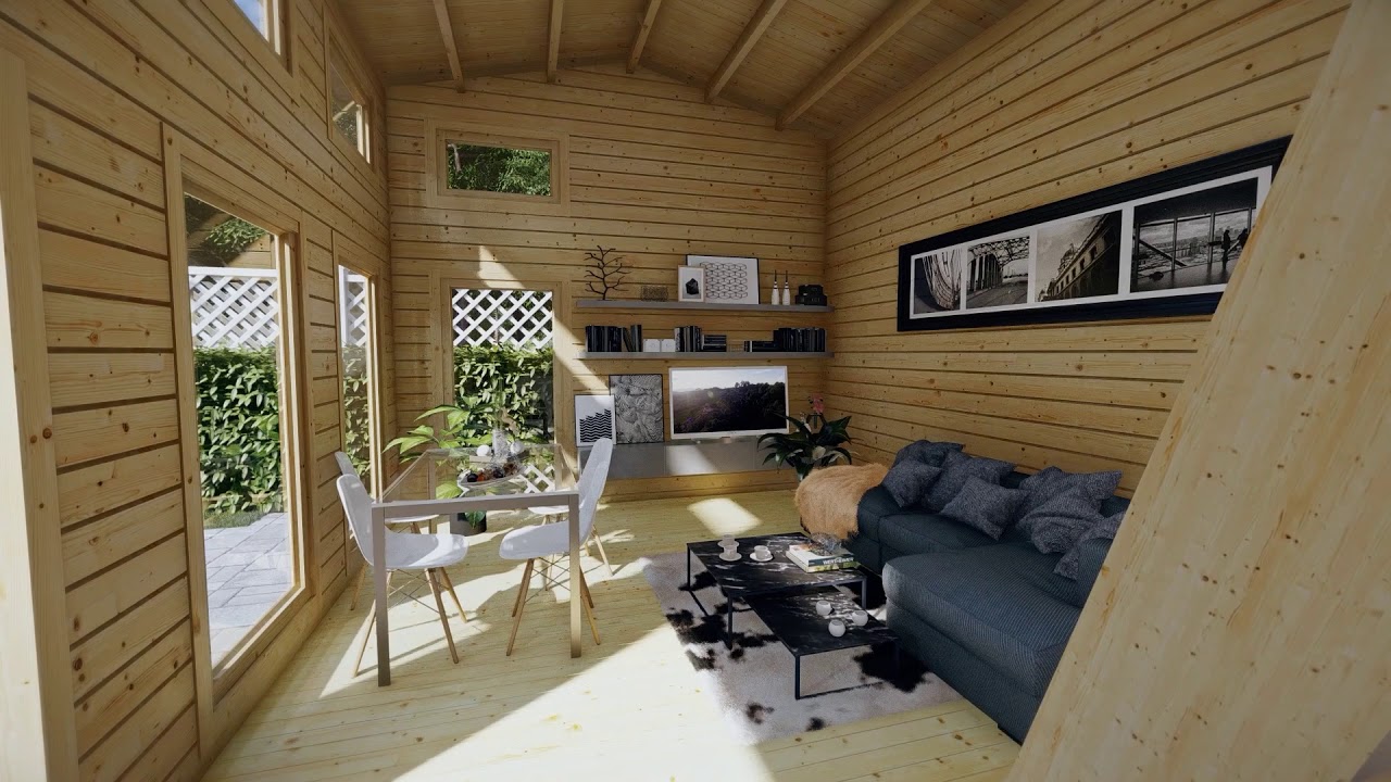 Sweden B XL timmerstuga med sovloft kan byggas på bara 7,4 x 3,9 m yta, men det ger dig mer än 35 m2 användbart utrymme. Dessa högkvalitetsstugor i Sverige-serien med sovloft används i stor utsträckning som campingstugor, trädgårdshus för uthyrning, fritidshus eller som en extra bostadsyta till ett befintligt hem.